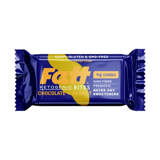 Fatt Chocolate + Peanut Keto Bites 35g. A peanut flavoured almond crème centre wrapped in quality dark chocolate. Made with only real food ingredients. High in prebiotic fibre. Packed with good fats - no seed oils. 4g carbs per bar. Sweetener free - no polyols or stevia. 100% natural. Made in UK.