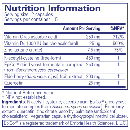 N-acetyl-l-cysteine, ascorbic acid, EpiCor® dried yeast fermentate complex (from Saccharomyces cerevisiae), Elderberry extract, quercetin, zinc citrate, ascorbyl palmitate (antioxidant), cholecalciferol. Vegetarian capsule (hydroxypropyl methyl cellulose)