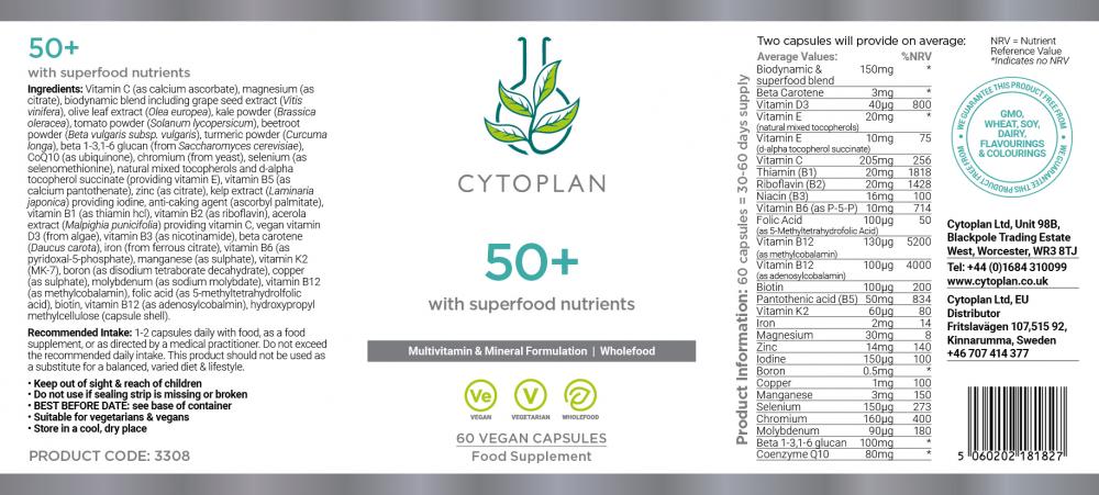 50+ is a comprehensive multivitamin and mineral supplement tailored to meet the needs of men and women over 50. It is now formulated with a UK first biodynamic and superfood fruit, vegetable and herb blend, which is especially rich in phytonutrients and active compounds.