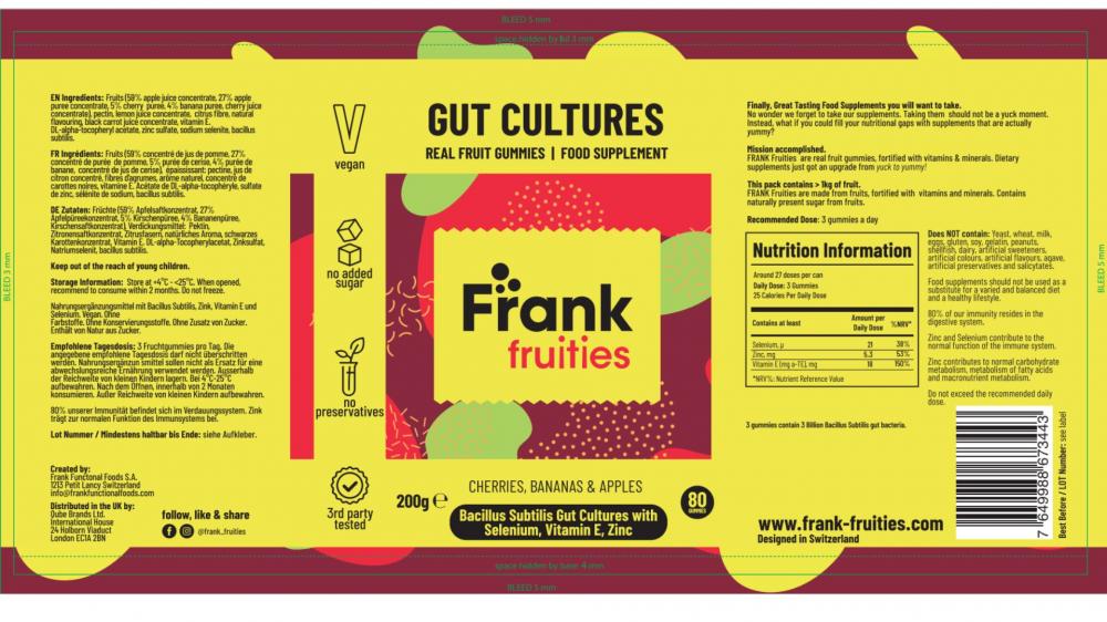 FRANK Fruities Gut Cultures digestive gummy supplement with live cultures, zinc, selenium, vitamin E, made from real fruits (apples, bananas, cherries). Vegan, no added sugar or preservatives.