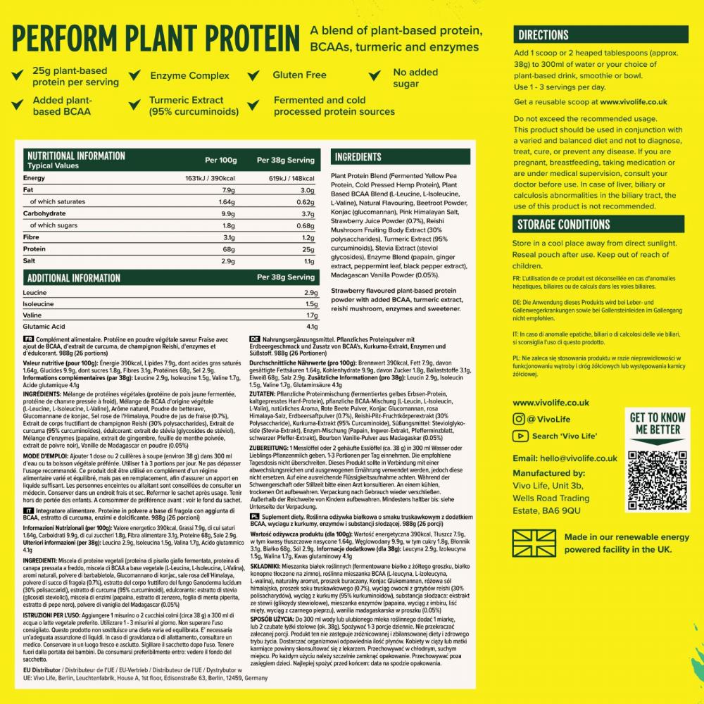 Perform Raw Plant Protein & BCAA Strawberry & Vanilla 988g